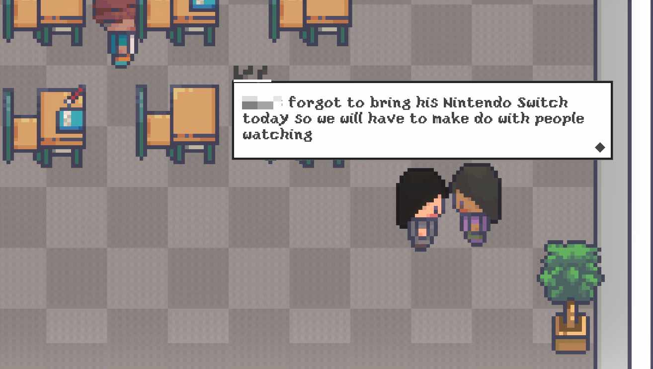My first order of business was thinking of the idea, which luckily came quite quickly. My plan was to create a game where you could play through different “major” parts of our relationship. Where we first met, had our first kiss, and more. You would play as either her or myself at